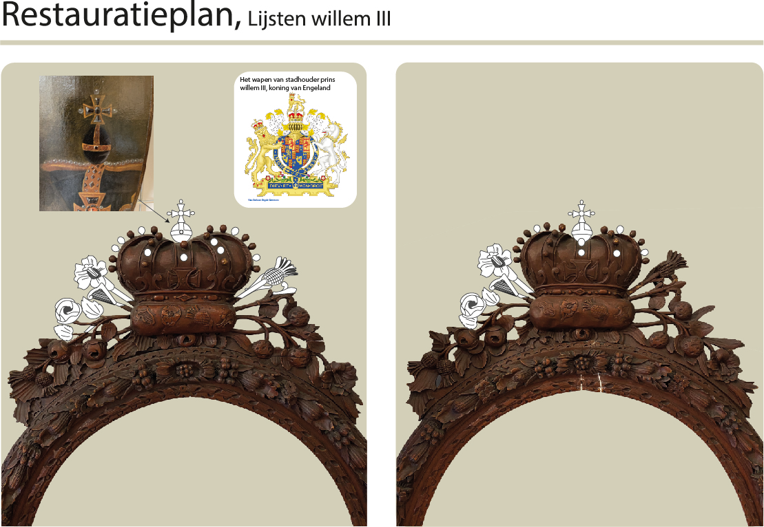 Boselie van Boekel kreeg van de Gemeente Zaltbommel de opdracht de twee schilderijen met bijbehorende lijsten van Willem III en Mary II Stuart te onderzoeken en restaureren. Na onderzoek is zorgvuldig in kaart gebracht wat de staat van de schilderijen was en wat er mistte aan het lijstwerk. De twee doeken zijn in het verleden eerder gerestaureerd. Hierbij zijn ze bedoekt met colofonium. Boselie van Boekel heeft de schilderijen gereinigd. Hierbij is de vergeelde vernis verwijderd en zijn enkele oude restauraties ongedaan gemaakt. Hierna zijn de schilderijen voorzien van nieuwe vernis. Bij de lijsten is voornamelijk het houtwerk gerestaureerd. De verbindingen zijn versterkt en missende ornamenten aangevuld met houtsnijwerk. Ook een volledige oppervlaktereiniging behoorde tot de werkzaamheden. Tevens hebben beide lijsten een houtwormbehandeling gekregen.